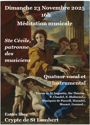 – La chorale d’enfants (ouverte à tous du CP à la 5ème) se reconstitue pour préparer un concert dans le cadre de St Lambert en fête le 22 Novembre, sur le thème de … « la musique ». Répétitions les mercredis 15 octobre, 12 et 19 novembre de 10h15 à 11h ou de 11h à 11h45 ; et les samedis 11 et 18 Octobre, et 8 Novembre, de 16h à 16h45. Il est souhaitable de venir à au moins 2 répétitions.